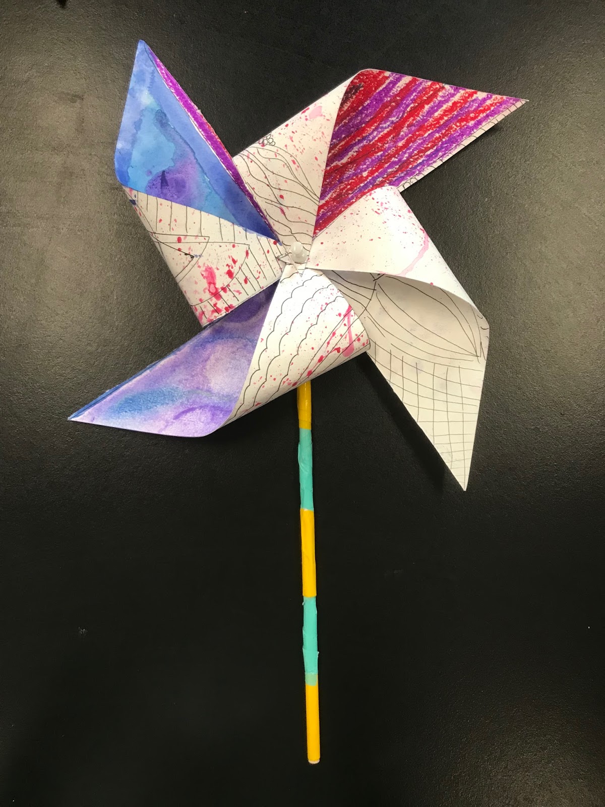 These past few weeks students in art club have made pinwheels. To decorate their pinwheels they used a different techniques and art materials for each section. Take a look at the end product!
